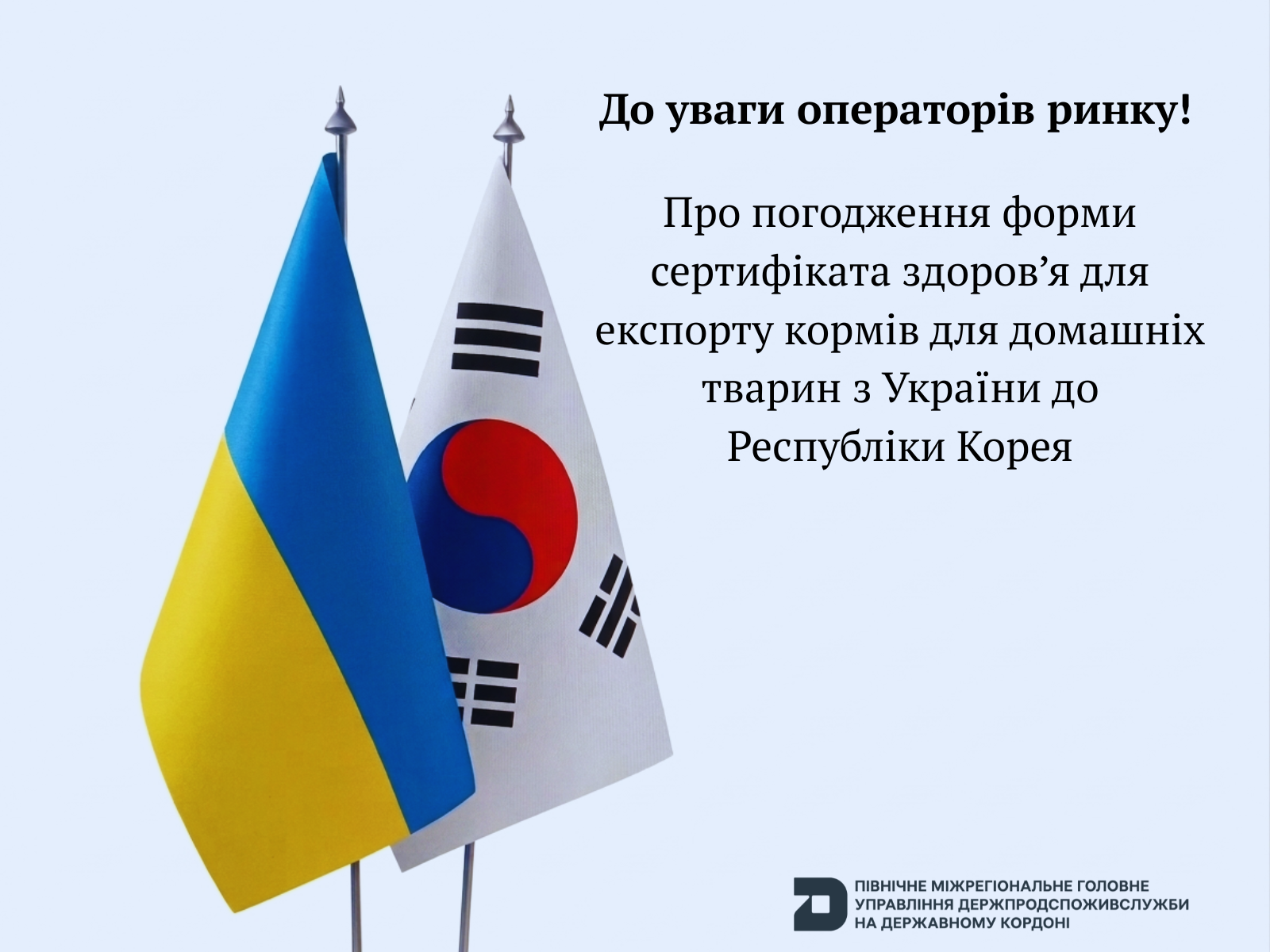 Державна служба України з питань безпечності харчових продуктів та захисту споживачів і Міністерство сільського господарства, продовольства та сільських справ (MAFRA) Республіки Корея погодили форму сертифіката здоров’я для експорту кормів для домашніх тварин з України до Республіки Корея.